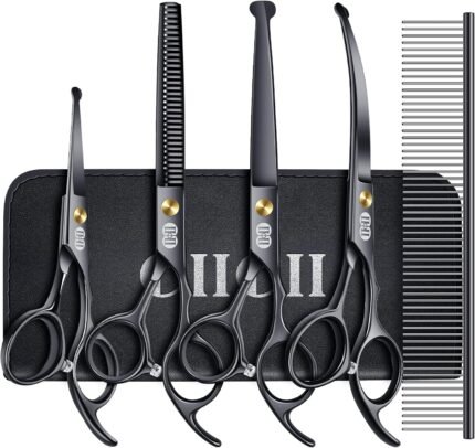 CIICII Dog Grooming Scissors Kit, 7 Inch Professional Pet Grooming Scissors Set with Safety Round Tip (Dogs/Cat Hair Cutting Trimming Thinning Shears with Curved Scissors) for DIY Home Salon (Black)
