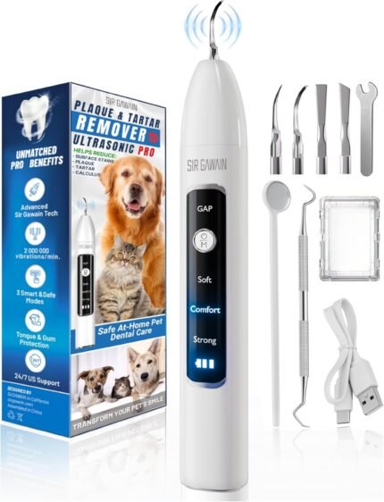 SIRGAWAIN Pet Ultrasonic Dental Cleaner — Plaque, Tartar & Stains Remover, 4 Tips, 3 Modes, LED, Contact-Activated & Smart Touch Protection, Complete Cleaning Kit for Dogs & Cats (White)