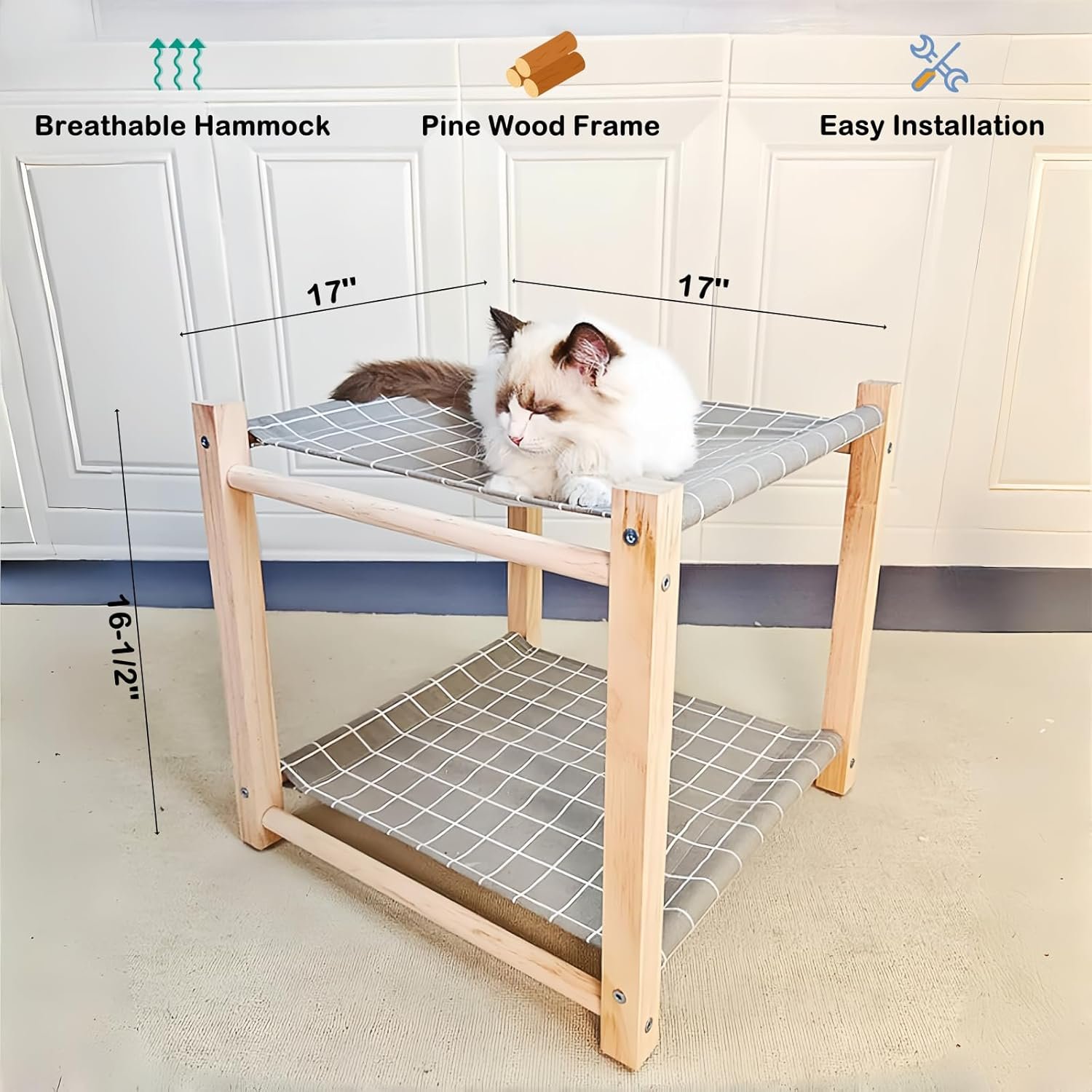 2 Layer Cat Hammock Bed for Indoor Cats, 17.0”×17.0” Big Size Cat Hammock, Pine Wood Elevated Cat Bed, Good for All Seasons(Grey)