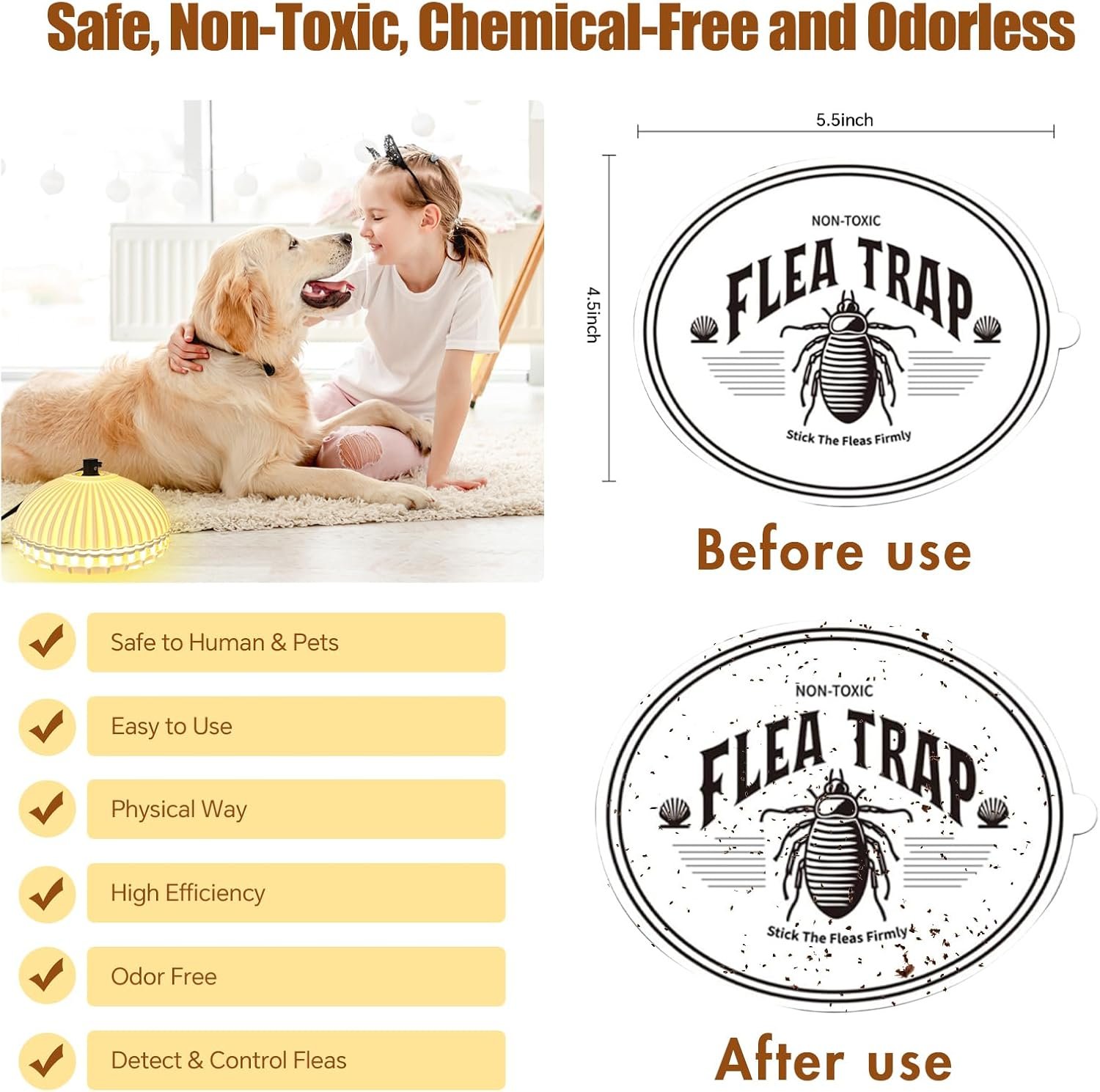 Wide Coverage: Our ultimate flea traps create a comprehensive defense against fleas. Just place it whether it’s the kitchen, living room, balcony, or bedroom, our traps provide a flea-free environment throughout your home without creating an unpleasant spray.