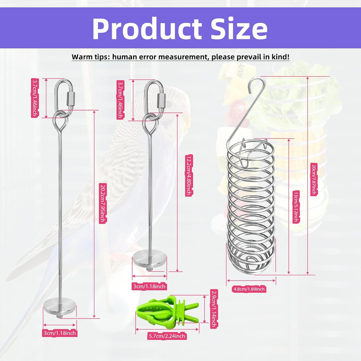 Material: Fruit forks are made of stainless steel, the forager toys are made of zinc alloy and steel, and the cage food clips are made of plastic. They are reliable, sturdy, and durable