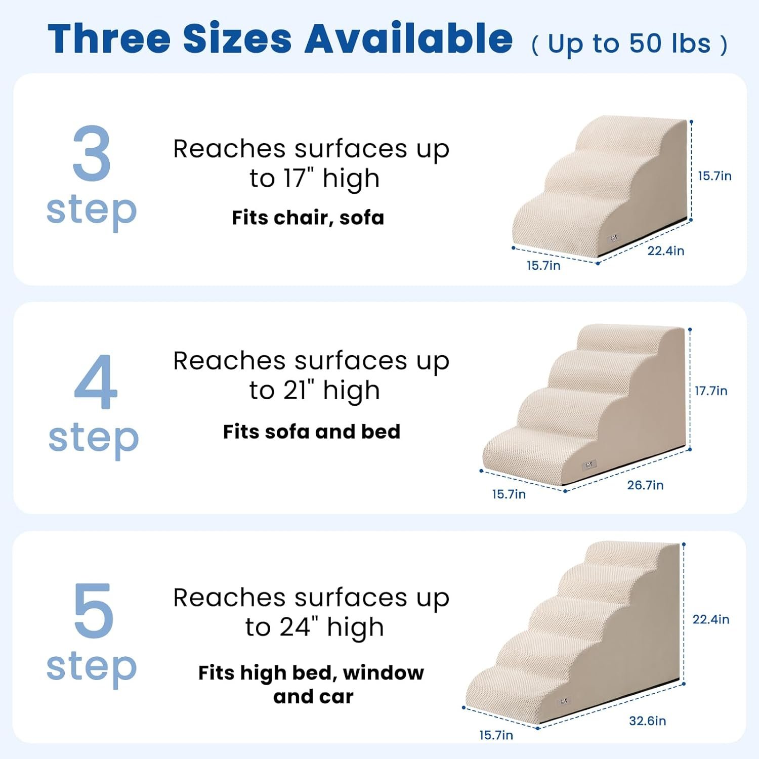 Three Height Options:Available in 3-step (H15.7″), 4-step (H17.7″), and 5-step (H22.4″) options to match different furniture heights. Choose 3-step for sofas, 4-step for medium beds, and 5-step for high beds