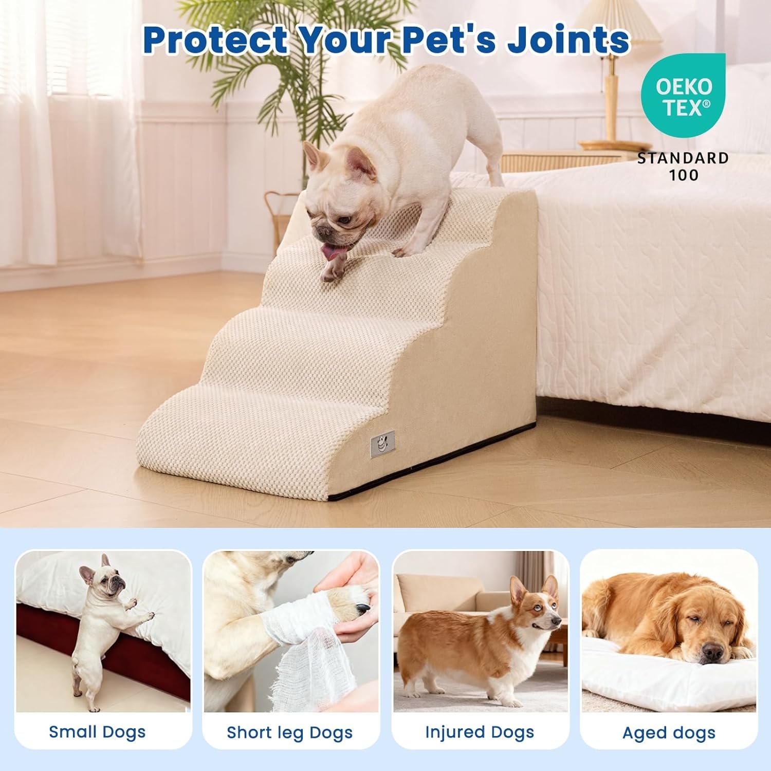 Multi-Scene Usage for Bed & Couch:Designed for small dogs and cats, these foam pet stairs help your furry friend easily climb onto beds, couches, or chairs. Perfect for elderly pets or those with limited mobility