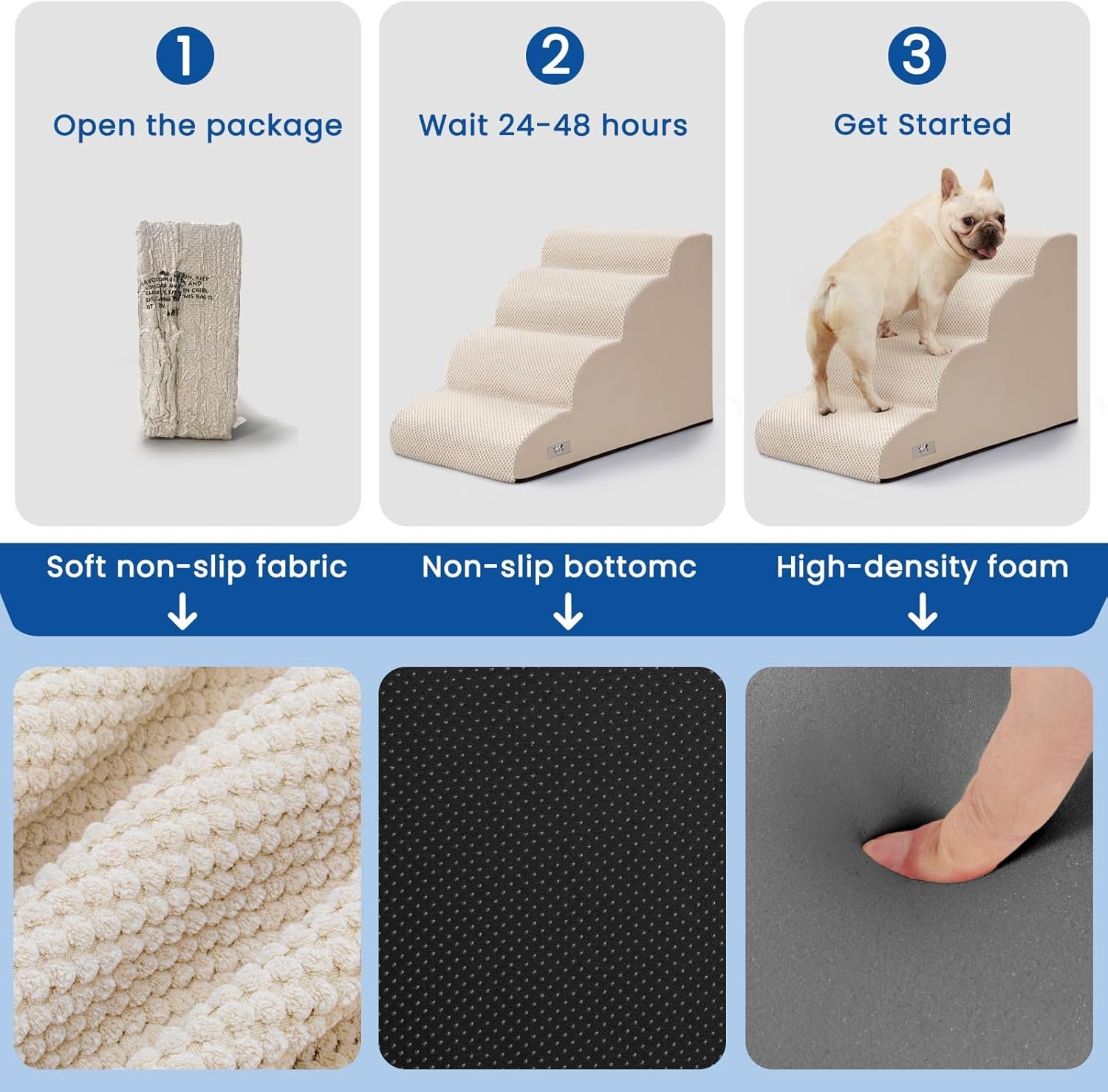 Stable & Supportive High-Density Foam:Built with 30D high-density foam for superior stability and comfort. The non-slip bottom keeps the dog steps steady while your pet climbs safely and confidently