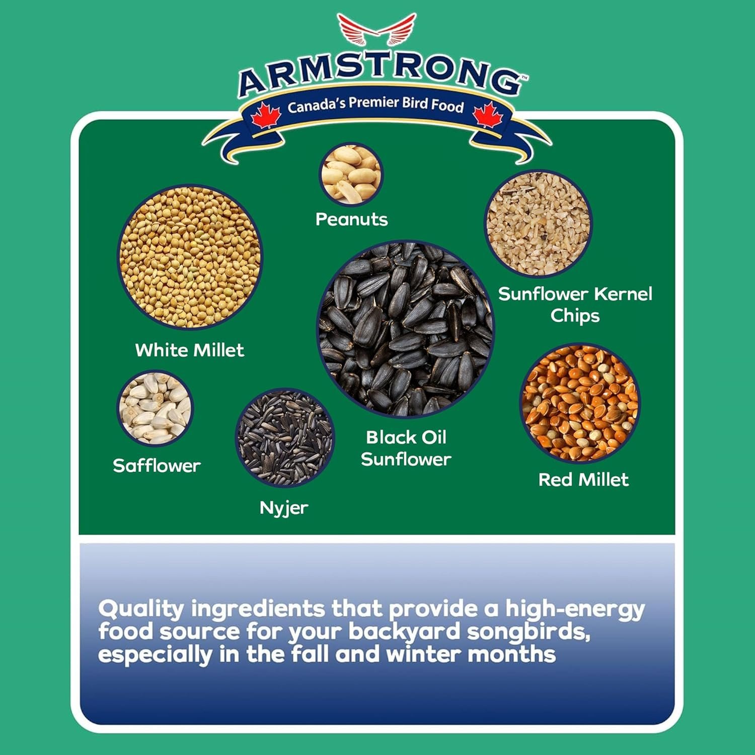 Ingredients that beautiful Songbirds love: Black Oil Sunflower, White & Red Millet, Sunflower Kernel Chips, Nyjer, Safflower, and Peanuts.