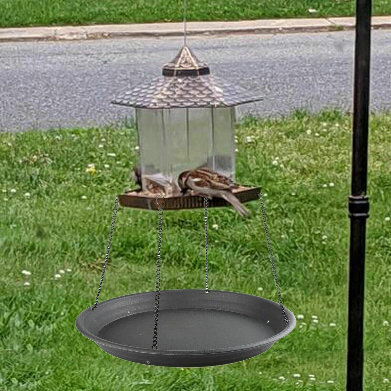BIRD SEED CATCHER TRAY: Bird Feeder Hanging Tray, Hanging the tray below a bird feeder and catches most falling seed and husk (bird feeder not included); Also a platform feeder, Seed Tray For Bird Feeders, Great for Attracting Birds Outdoors, Backyard, Garden. LESS MESS AND MINIMIZING THE WASTE: Keep a generous supply of seed in a clean and organized feeder tray, help reduce seed waste, allow clean bird feeding in your backyard. Protects your yard from weeds and rodents, by catching fallen bird seed before it reaches the ground. UNIVERSAL DESIGN : Our Large bird seed tray fits for Most sized bird feeders. Please check the size before you buy it. CONSIDERATE DESIGN WITH NO GLISTENING EFFECT CHAINS: Different from other Zinc plated chains seed tray, our bird seed catcher tray design with no reflecting light effect -BIRD FRIENDLY-black chains and “S” hook could fit securely to most bird feeders ALSO A PLATFORM FEEDER: Open hanging platform feeders let you check seed level at glance; three drain holes in base allows the water to easily drain out; not only catches the seeds that were being wasted on the ground, but slowed the rate at which the feeders empty