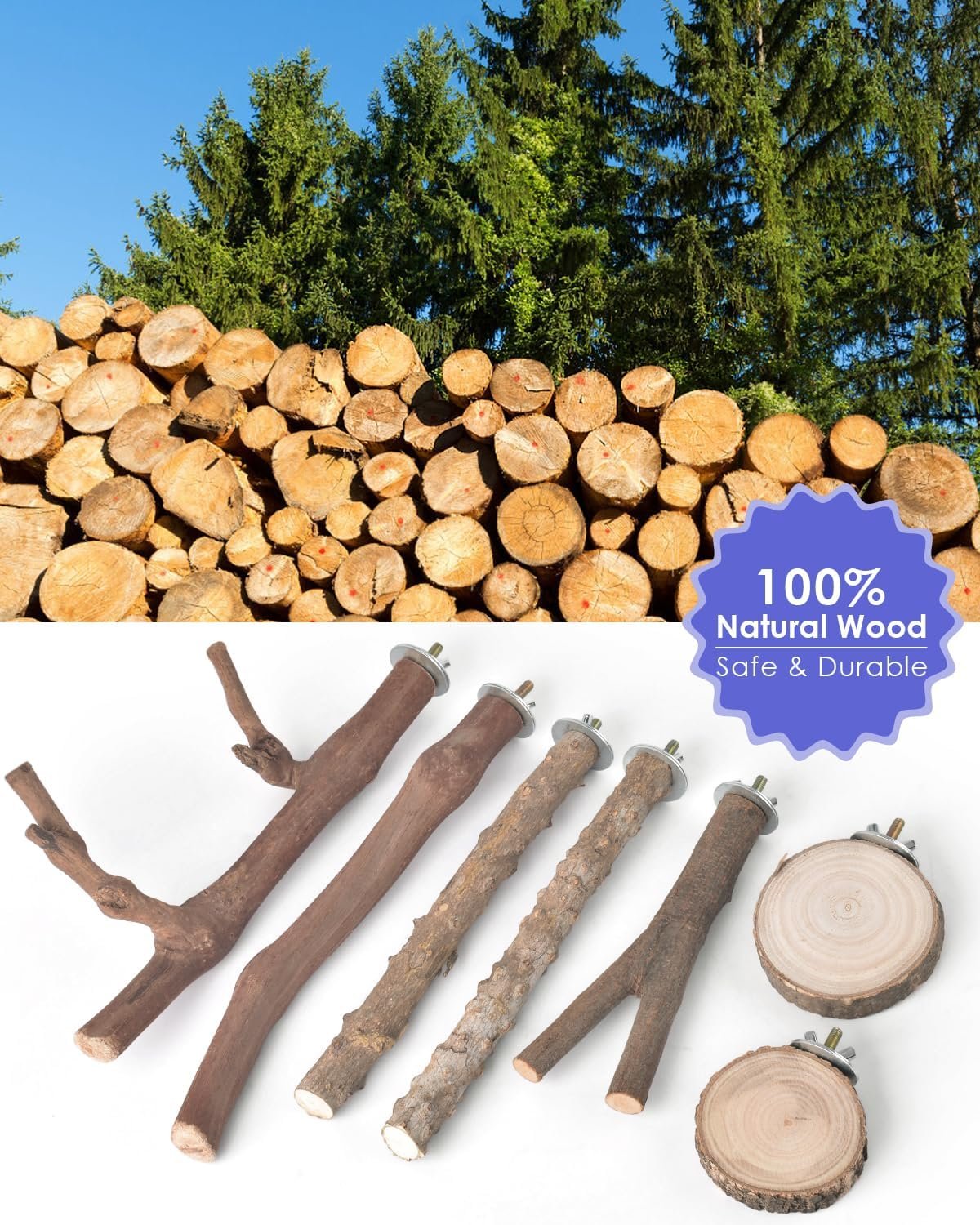 Natural Materials: Parrot perches are made of natural grapevines wood prickly ash wood and apple wood, without paint or chemical odor. It is non-toxic, harmless, safer and more durable, in line with the living habits of birds