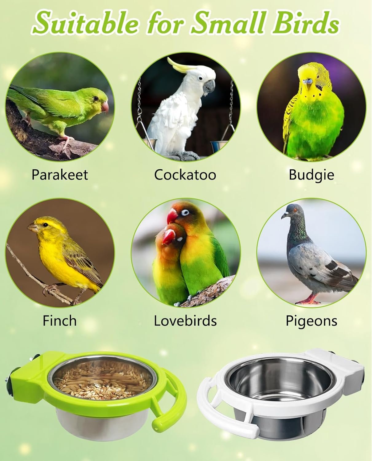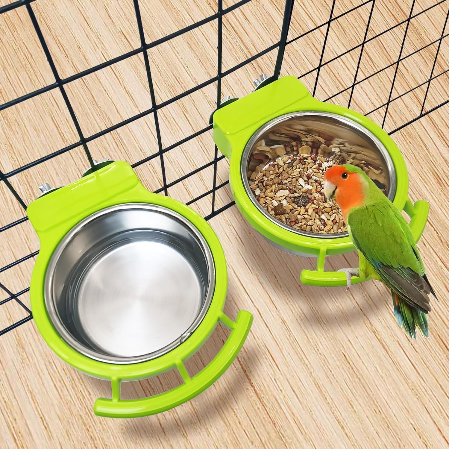 BNOSDM 2 PCS Stainless Steel Bird Bowls Bird Feeding Dish Water Cups Perch Stand Hanging Parakeet Food Container Food and Water Bowls with Spoon for Budgie Cockatoo Finch Lovebirds (Green)