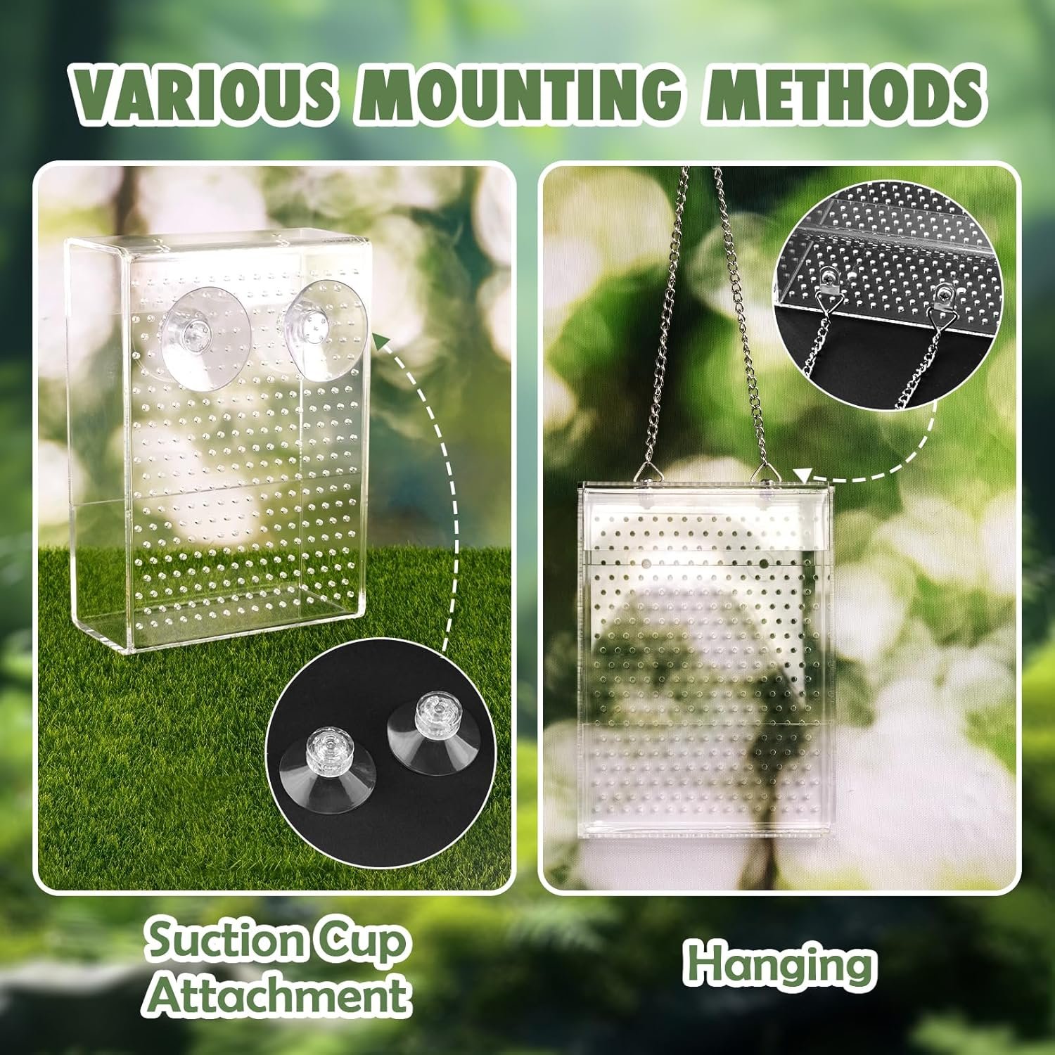 Multiple installation: Reptile feeding bowl offers suction cup wall hanging and metal chain hanging, two fixed installation methods, which can meet a variety of scenarios.