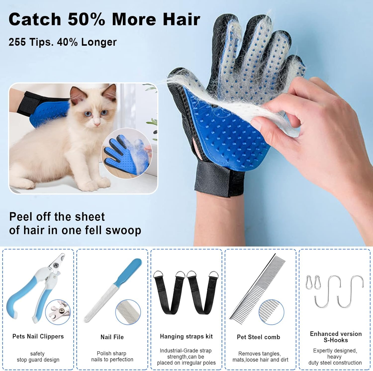 PROFESSIONAL DOG GROOMING KIT: Grooming gloves x 1 (right hand), Nail clipper x 1(safety stop guard design), Nail file x 1, Pet comb x 1, Premium S-hook x 2 (suitable for the round bar), Hanging Sling x 2(suitable for the irregular bar ). Even at home, you can easily accomplish the same things as the pet hospital grooming table, such as trimming nails, grooming, bathing, checking various body indicators, etc. Our pet hammock is not suitable for dogs larger than 65Ib