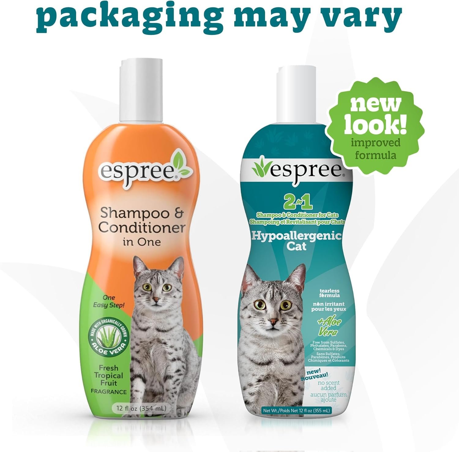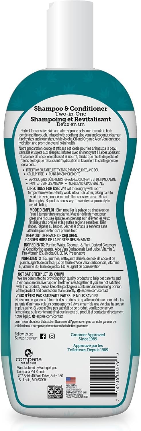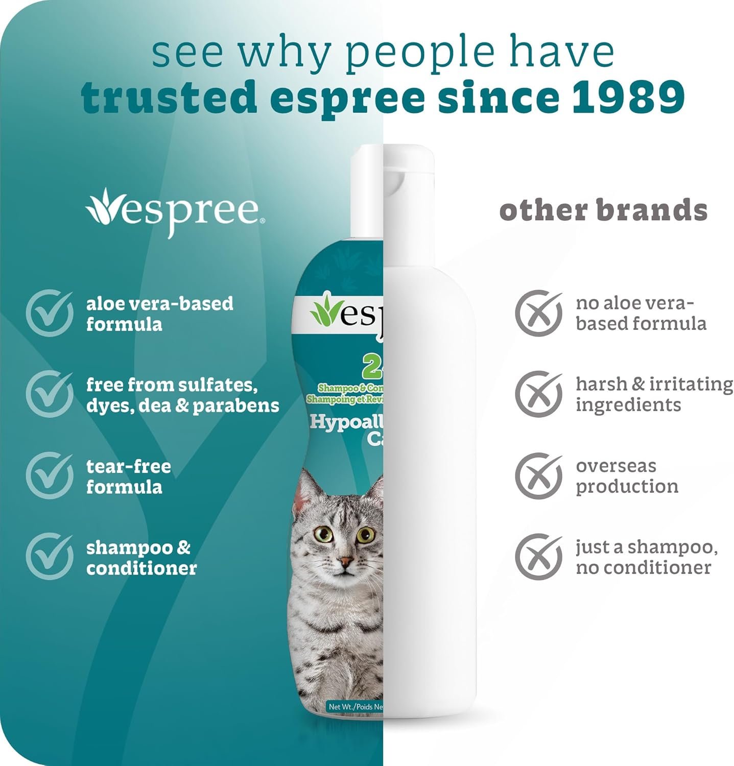 Introducing our Espree Hypoallergenic Cat Shampoo & Conditioner, designed with your cat’s comfort and safety in mind. This tearless formula ensures a stress-free bathing experience, as it is gentle on cats with sensitive skin or who suffer with allergies. The key ingredient, Aloe Vera, is used for its soothing and hydrating properties, which helps maintain your cat’s natural moisture while keeping their coat soft and shiny. Unlike other products on the market, this cat shampoo and conditioner is completely free of harsh chemicals such as sulfates, parabens, and artificial dyes, making it ideal for cats with sensitive skin. Our 2-in-1 formula simplifies the grooming process by combining shampoo and conditioner in one easy step. It cleanses, conditions, and leaves your cat’s coat soft, fluffy, and smelling fresh. With no harsh additives, it’s safe for regular use and will not strip your cat’s skin of its natural oils. Espree has been trusted and approved by groomers since 1989, so trust that we will keep your cats clean.