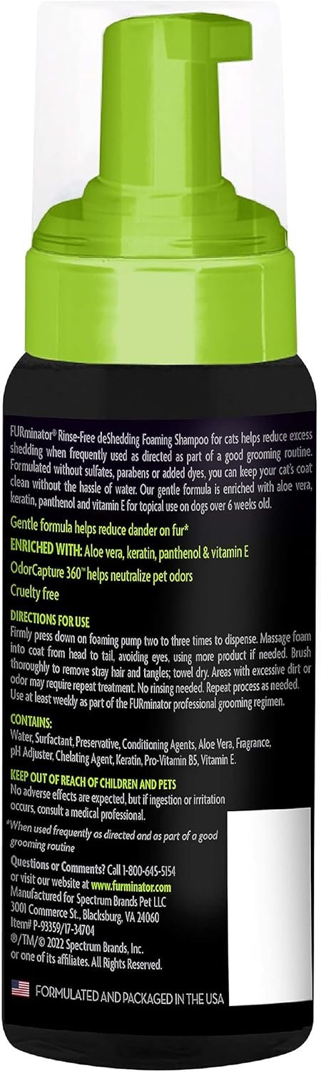 Take your grooming routine into your own hands by implementing the FURminator® Ultimate Hair Reduction System™: Brush, deShed, Bathe and Maintain for grooming confidence in the comfort of your own home. Our deShedding tools, grooming tools and hair solutions offer a grooming regimen catered to any dog or cat. FURminator® Rinse-Free deShedding Foaming Shampoo for cats helps reduce excess shedding and helps prevent hairballs without bathing* when frequently used as directed as part of a good grooming routine. Formulated without sulfates, parabens or added dyes, this gentle, cruelty-free formula is for topical use on cats over six weeks old. The FURminator® deShedding formula is enriched with aloe vera, keratin and vitamin E – conditioning agents that help you keep your cat’s coat clean and moisturized without the hassle of water. Plus, this foaming shampoo refreshes and helps deodorize your cat’s coat between baths with OdorCapture 360™, a technology that helps neutralize pet odors. Firmly press down on foaming pump two to three times to dispense. Massage foam into coat from head to tail, avoiding eyes, using more product if needed. Brush thoroughly to remove stray hair and tangles, then towel dry. Areas with excessive dirt or odor may require repeat treatment. No rinsing needed. Use at least weekly as part of the FURminator® professional grooming regimen. *Results may vary.