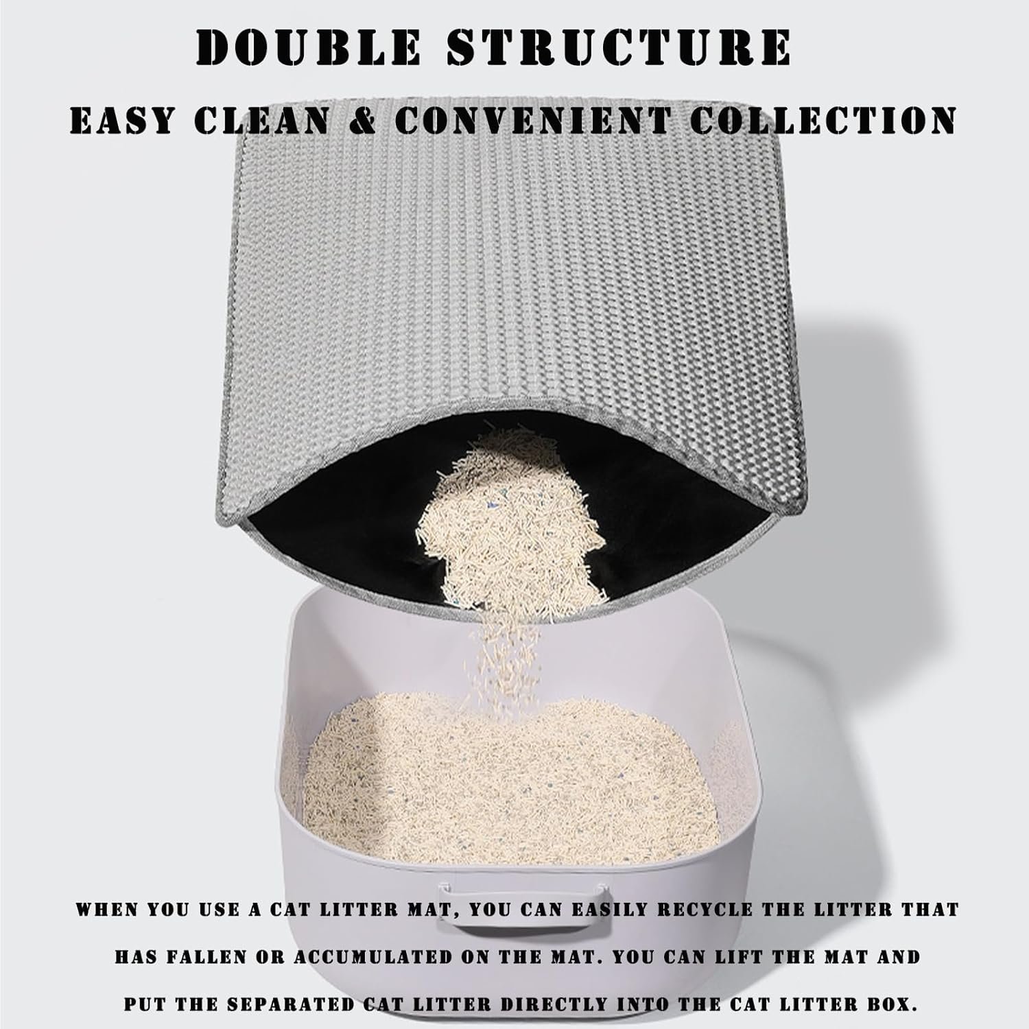 You can lift the mat and place the litter into the litter box. You can reuse the cat litter collected inside the mat, keeping the environment around the cat litter box clean and save your cleaning time.