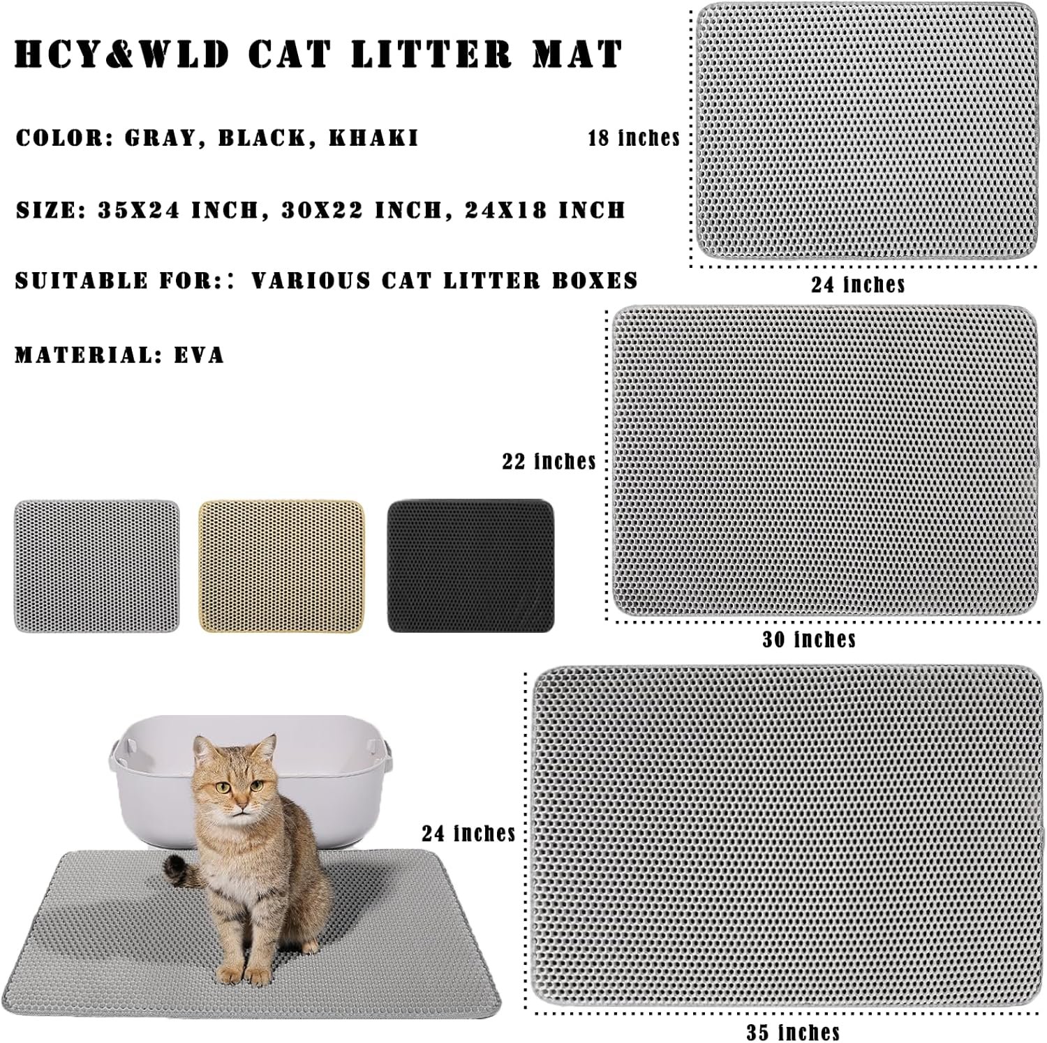 HCY&WLD Cat Litter Mat, 45×26/35×24/30×22/24×18 Inch Double Layer Cat Litter Box Mat, EVA Non-Slip, Waterproof Urine Proof Cat Litter Catcher Mat, Easy Clean Scatter Control (30×22 Inch, Black)