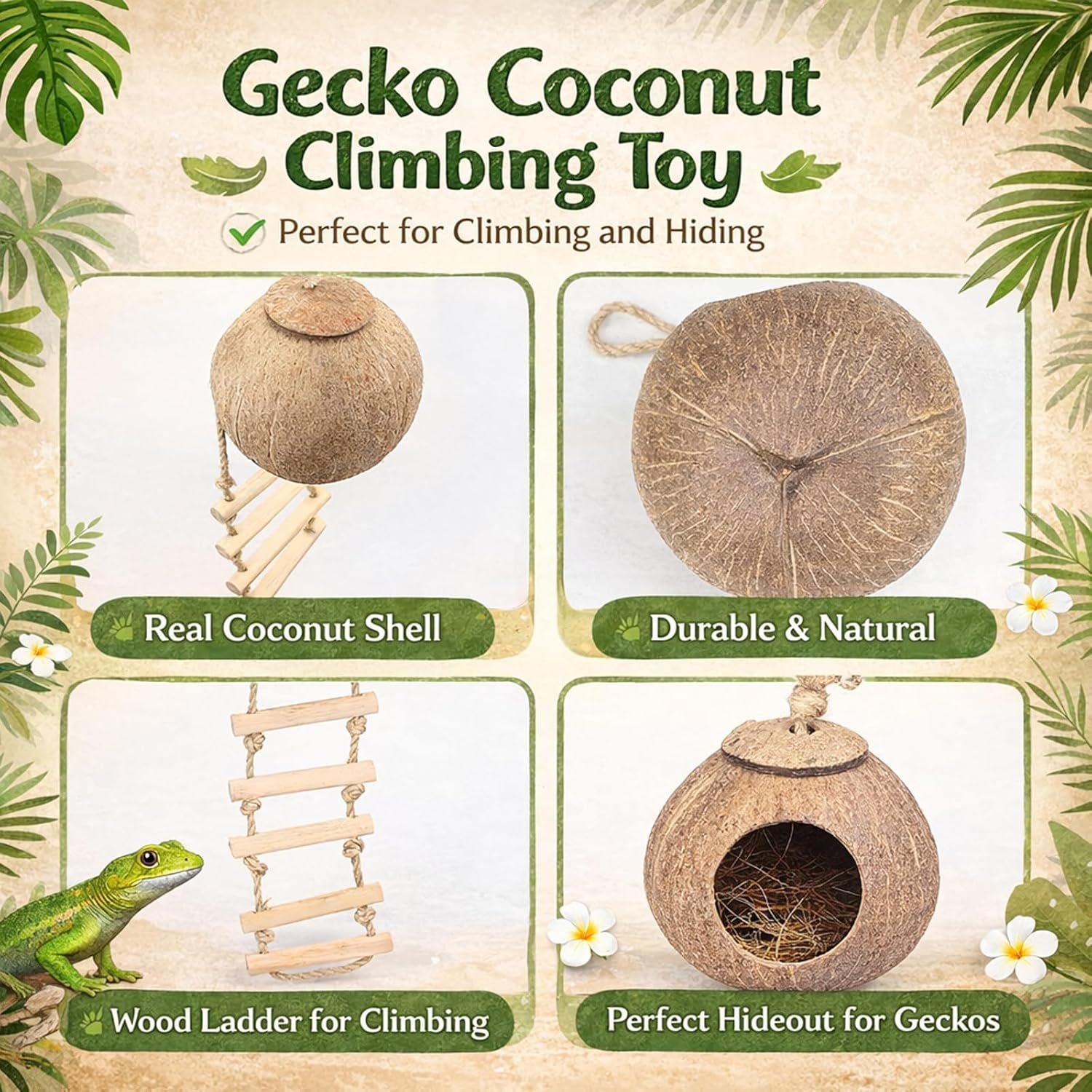 Climbing Ladder: HERCOCCI coconut shelter provides the perfect hollow space for placing food or when they just want to nap in a sheltered space. Ladder serves as a bridge to go across the enclosure.