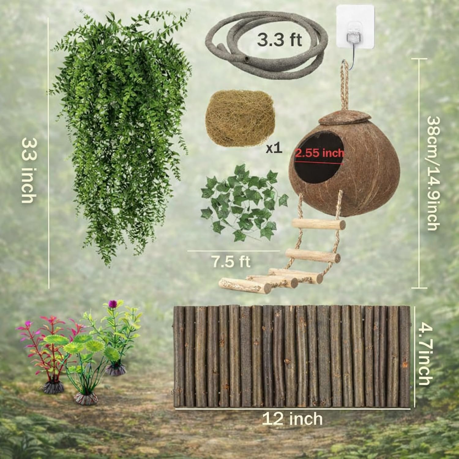Package include: Coconut house is made of 100% natural coconut, making it safe for pets. 14.9inch-1x coconut house, 3.3ft-1x reptile vine, 1 x Wood Bridge, 1 x Reptile Hanging Plant, 3x Stand plants, 1 string of leaves, 1x coconut fiber.