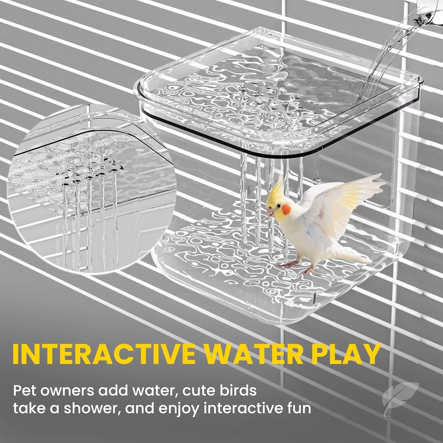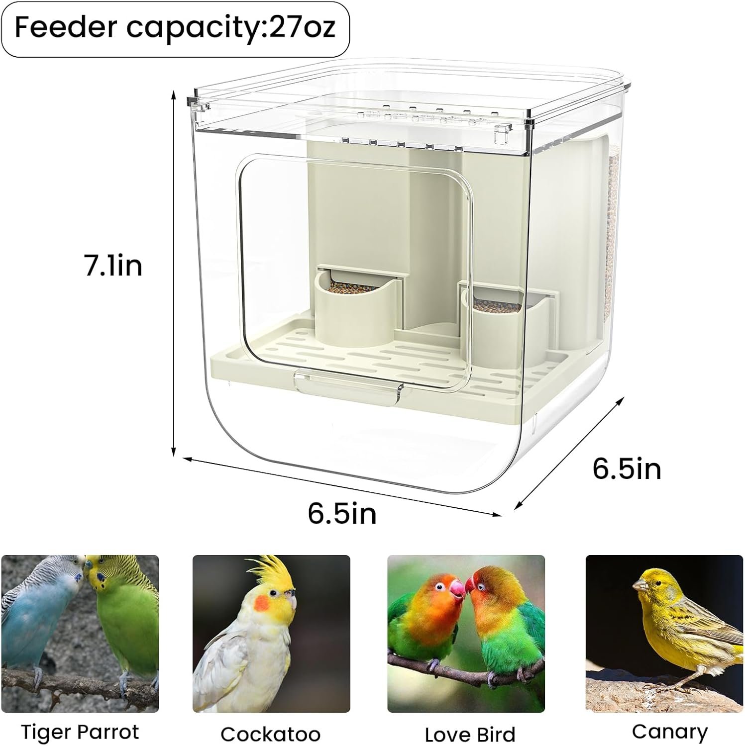 【Increased size】This product measures 6.49 x 6.5 x 7.08 inches, accommodating multiple birds for bathing simultaneously. The feeder holds 27 ounces, supporting extended feeding sessions. Suitable for small to medium-sized birds including budgerigars, cockatiels, canaries, lovebirds, peacocks, and starlings.