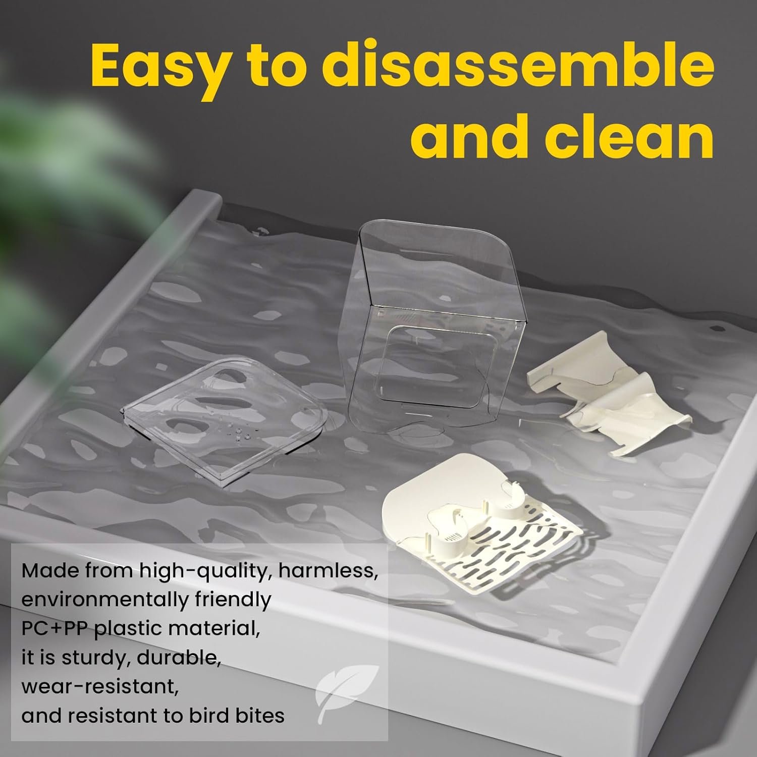 【Safe materials】This feeder is crafted from premium PC+PP plastic. Its high hardness ensures durability, resisting bird pecking and withstanding drops while maintaining high transparency. Non-toxic, odorless, and corrosion-resistant, it safeguards your birds’ health.