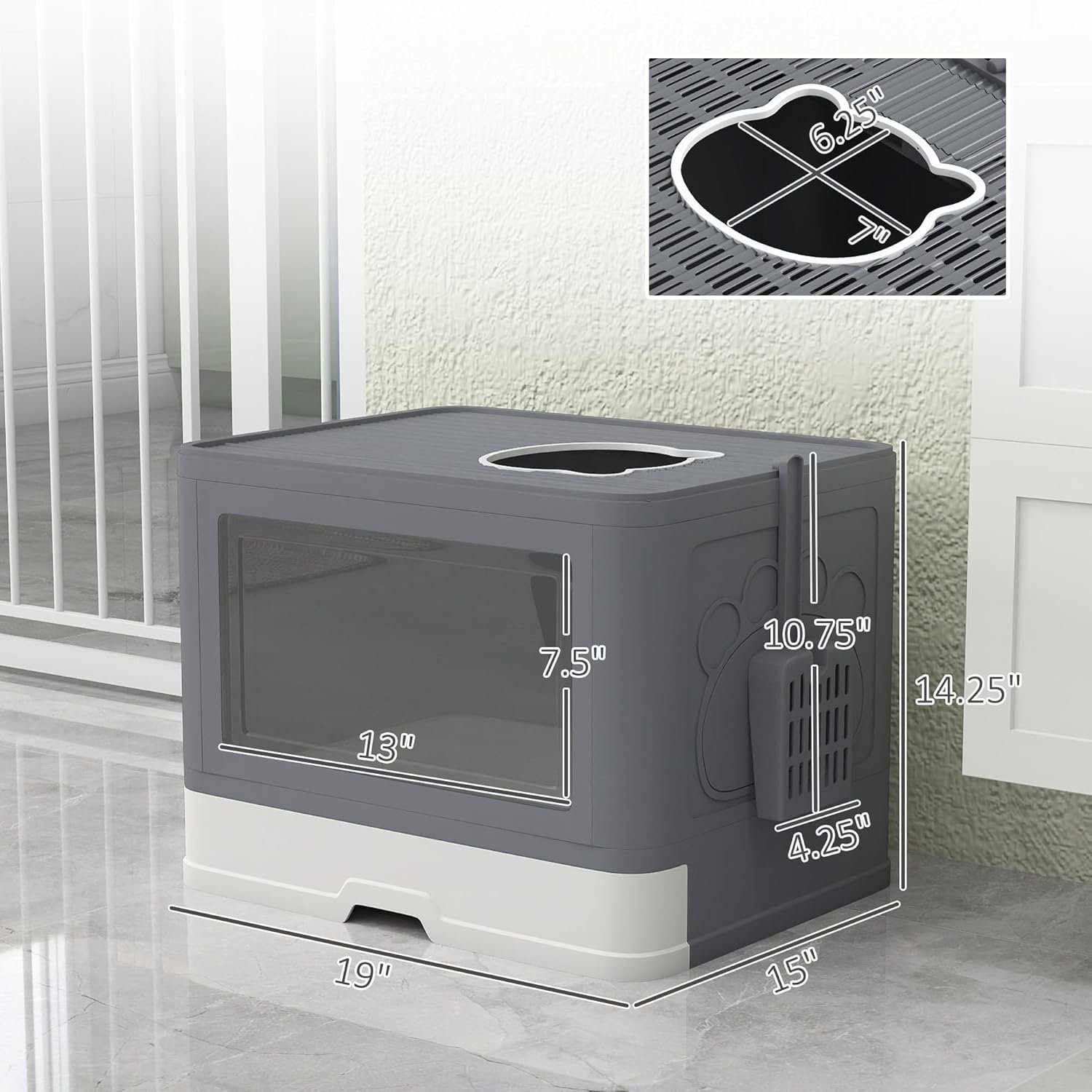 Color Gray, White Material Polypropylene Overall Dimensions 19″ L x 15″ W x 14.25″ H Inner Space Dimensions 19″ L x 14.5″ W x 13.75″ H Front Door Dimensions 13″ W x 7.5″ H Top Door Dimensions 7″ L x 6.25″ W Storage Box Dimensions 5″ L x 2″ W x 2″ D Tray Dimensions 18″ L x 13.75″ W x 3.25″ D Scoop Dimensions 10.75″ L x 4.25″ W x 1.5″ D Cat Brush 8.75″ W x 4.75″ H Folded Dimensions (Disassembled) 19″ L x 15″ W x 5″ H Item Label D31-085V00GY