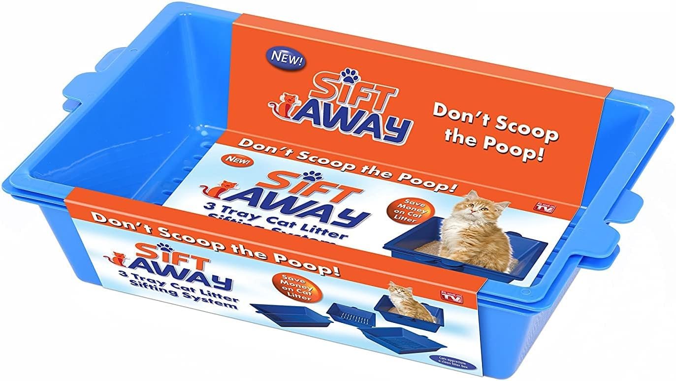 Clean litter in three easy steps- don’t scoop the Poop! Sift Away is the ingenious 3-tray litter sifting system. Simply lift the top layer – clean litter sifts through and dirty litter remains, ready to be tossed away. Rotate tray 180 degrees and place on bottom. Sift Away is ready for use – it’s that easy!