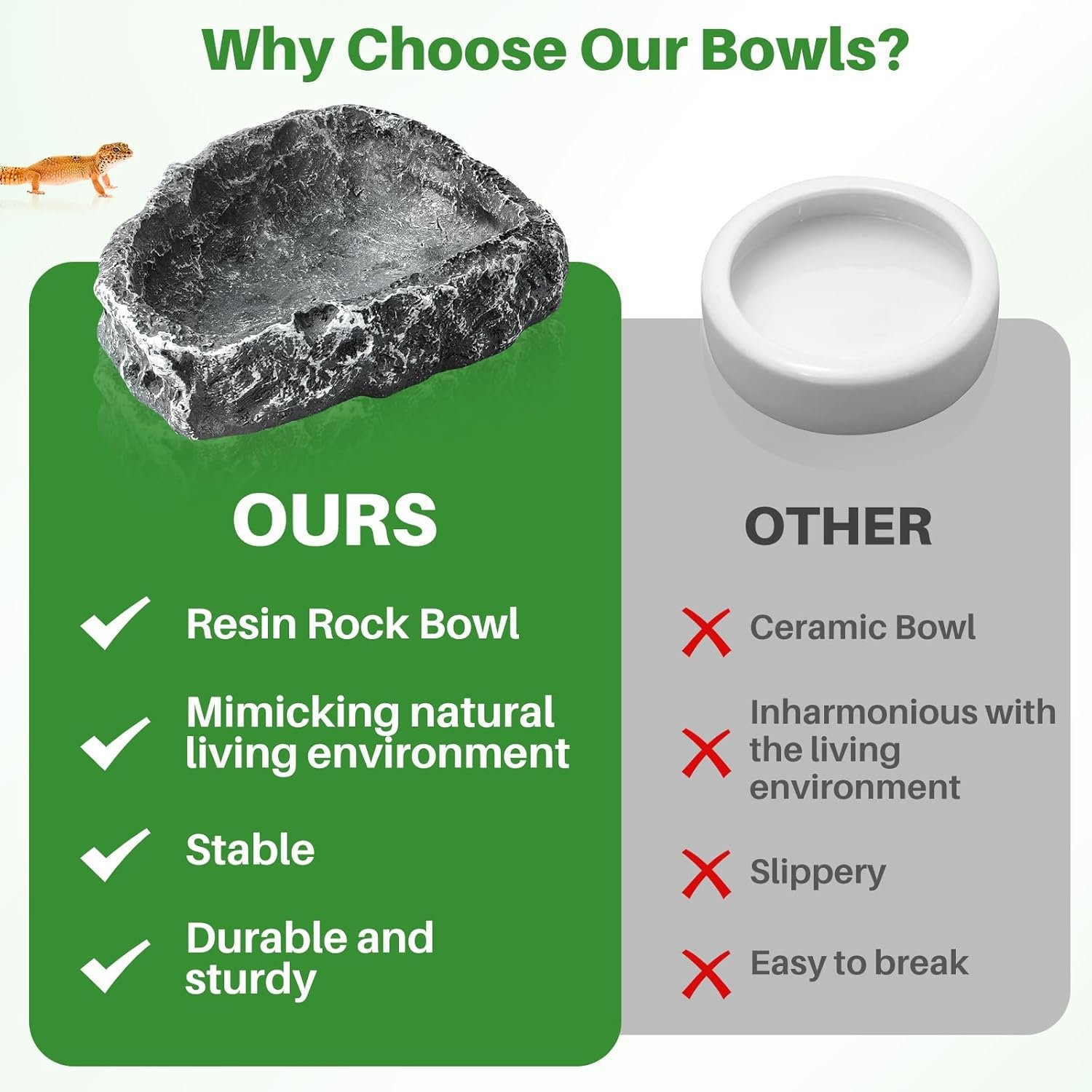 Tank-Ready Resin: Designed for bearded dragon enclosures and all reptile habitats, this food-grade resin reptile water dish and reptile food bowl features a smooth, non-porous surface that will not hide food or stains. Durable material withstands bites and claws. Essential kit for reptile tank setups.